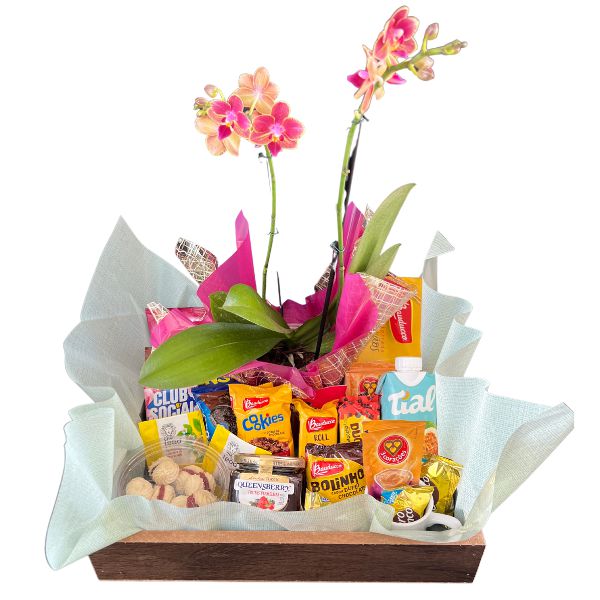 A Cesta Café da Manhã Sofisticada é uma linda cesta com 1 Mini Orquídea e deliciosos alimentos de café da manhã, para você supreender aquela pessoa especial em sua vida!