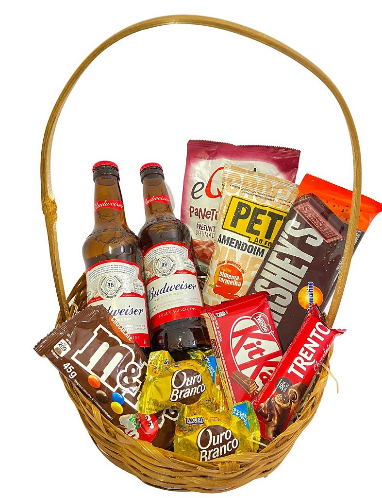 Itens da cesta: 2 Budweiser / 2 Bombons Ouro Branco / 1 M&Ms / 1 Kitkat / 1 Trento / 1 Barra de Chocolate 90g / 1 Amendoin Petiz / 1 Equilibri / 1 Lindo cartão personalizado.
