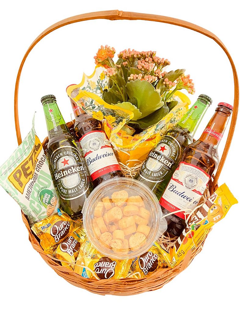Itens da cesta: 2 Heineken / 2 Budweiser / 1 Amendoin / 4 Bombons / 1 M&M / 1 Torrada / 1 Lindo cartão personalizado.