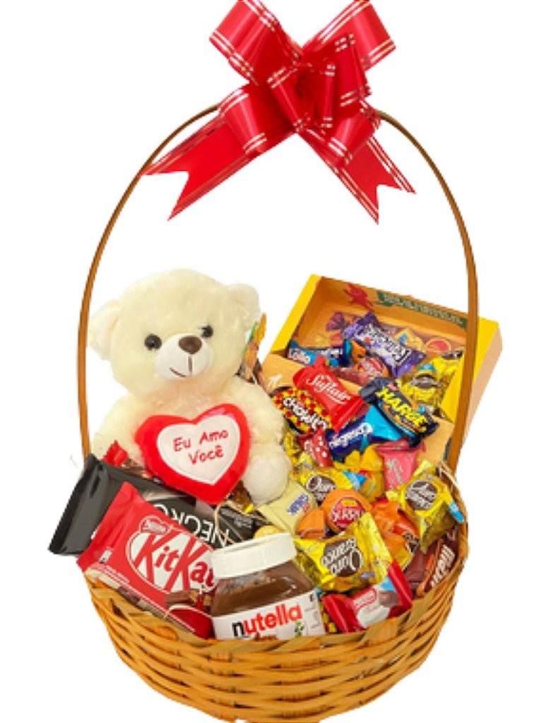 Itens da Cesta: 1 Pelúcia / 1 Barra Diamante Negro 90g / 4 Bombons Ouro Branco / 1Kit Kat / 1 Caixa de Bombom Garoto aberta / 1 Trento / 1 Caixa de Bombom Nestle aberta / 1 Nutella / 1 Lindo cartão personalizado.