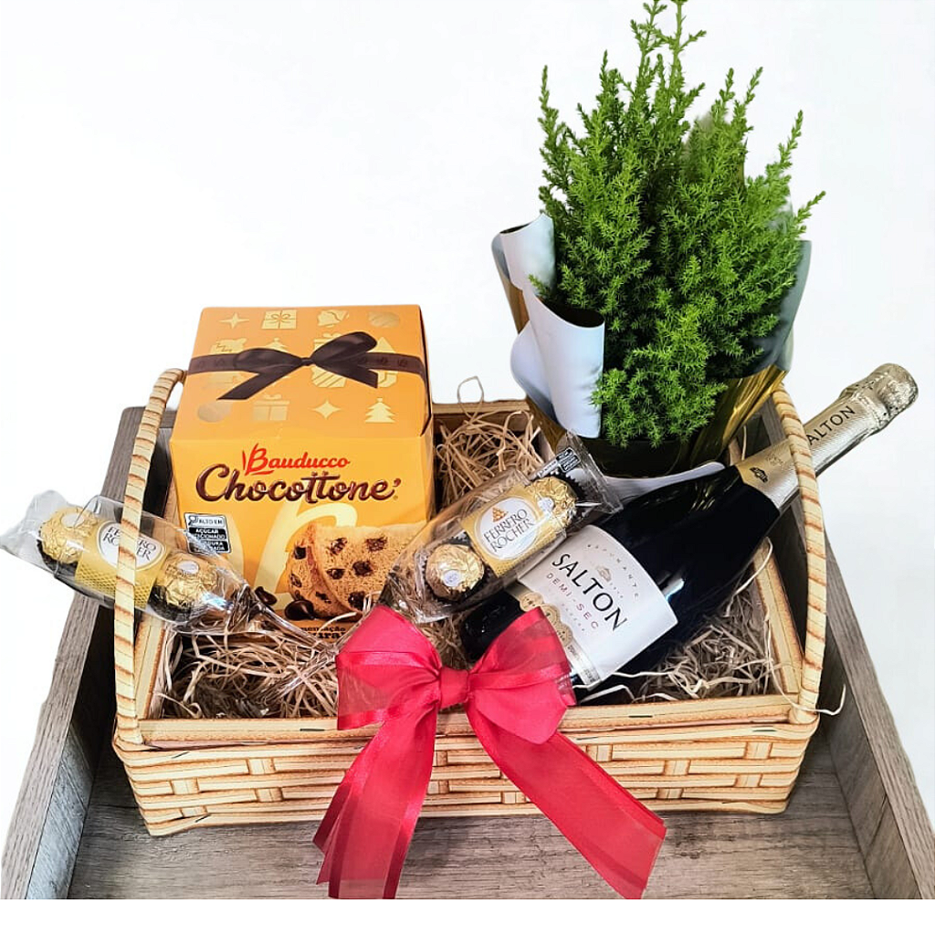 Itens da Cesta: / 1 panettoone ou chocottone / 1 salton / 1 pinheiro / 6 ferrero rocher / 2 taça / 1 Lindo Cartão personalizado com sua mensagem.